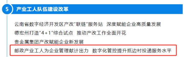 12月5日,云南省總工會(huì)發(fā)布2024年11月云南工會(huì)重點(diǎn)工作創(chuàng)新案例名單,云南郵政工會(huì)報(bào)送的《郵政產(chǎn)業(yè)工人為企業(yè)管理獻(xiàn)計(jì)出力 數(shù)字化管控提升抵邊村投遞服務(wù)水平》入選“產(chǎn)業(yè)工人隊(duì)伍建設(shè)改革”創(chuàng)新案例。