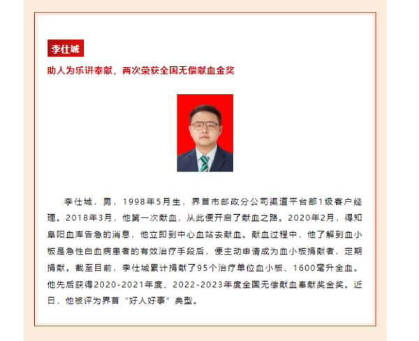 經(jīng)推薦、審核、投票、評(píng)議等程序,阜陽(yáng)郵政李仕城獲評(píng)助人為樂(lè)類第四季度“阜陽(yáng)好人”。 2018年3月,李仕城第一次獻(xiàn)血,從此便開(kāi)啟了獻(xiàn)血之路。2020年2月,得知阜陽(yáng)血庫(kù)告急的消息,他立即到中心血站去獻(xiàn)血。獻(xiàn)血過(guò)程中,他了解到血小板是急性白血病患者的有效治療手段后,便主動(dòng)申請(qǐng)成為血小板捐獻(xiàn)者,定期捐獻(xiàn)。截至目前,李仕城累計(jì)捐獻(xiàn)了95個(gè)治療單位血小板、1600毫升全血。他先后獲得2020-2021年度、2022-2023年度全國(guó)無(wú)償獻(xiàn)血奉獻(xiàn)獎(jiǎng)金獎(jiǎng)。