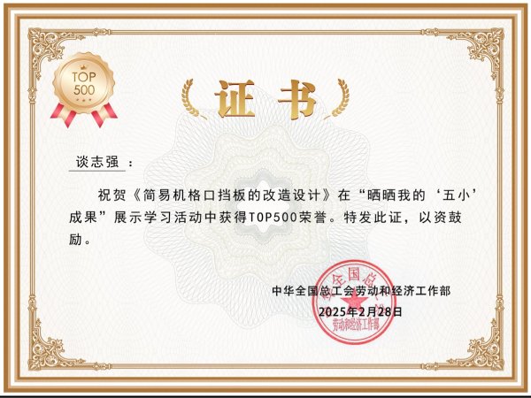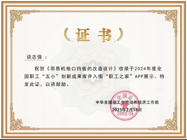 中華全國總工會(huì)2月18日頒發(fā)證書:祝賀江蘇郵政報(bào)送的《簡易機(jī)格口擋板的改造設(shè)計(jì)》創(chuàng)新項(xiàng)目被成功收錄于2024年度全國職工“五小”創(chuàng)新成果庫并入圍“職工之家”APP展示。該創(chuàng)新項(xiàng)目在中華全國總工會(huì)組織開展的“曬曬我的‘五小’成果”展示學(xué)習(xí)活動(dòng)中獲得T0P500榮譽(yù)。