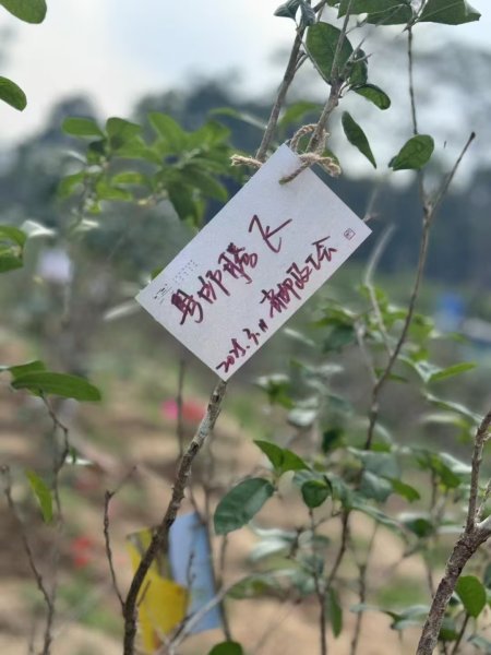 植樹現(xiàn)場,80多名本部員工分工有序,兩三人一組,揮鍬鏟土、扶苗培土、踩實澆水,每一個步驟都凝聚著大家對環(huán)境保護(hù)的責(zé)任感和對綠色未來的期待。一片歡聲笑語中,50棵桂花樹傲然挺立,它們不僅承載著生命的希望,更寄托著員工們的美好祝愿。每棵樹苗上都掛上了精心準(zhǔn)備的心愿卡,字里行間滿是對小樹苗茁壯成長的殷切期盼。