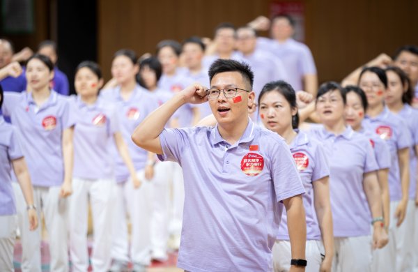 莊嚴(yán)的國歌響起,大家注視著國旗,唱響國歌,心中涌動愛國的熱情。國旗引領(lǐng),旌旗飄揚(yáng)。各戰(zhàn)隊旗手揮動手中的紅旗,列隊奔跑,搖旗吶喊,一面巨幅國旗越過方陣來到前場,將迎旗儀式推向了高潮。