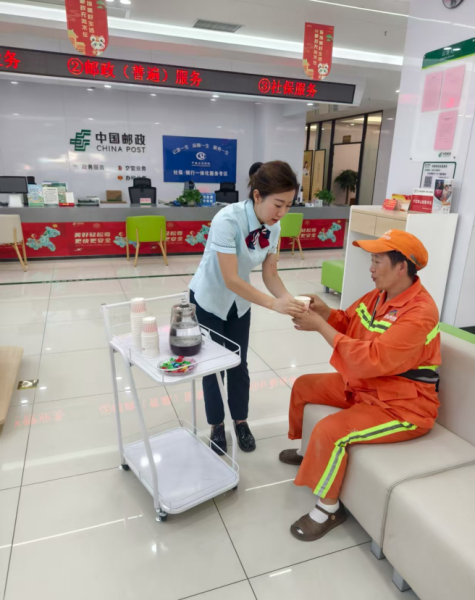 活動(dòng)中,郵政工作人員親手將一瓶瓶冰鎮(zhèn)飲料遞到環(huán)衛(wèi)工人手中,并真誠地道一聲“辛苦了”。一位剛結(jié)束早班清掃的阿姨感動(dòng)地說:“能有個(gè)地方坐一坐、喝口水,心里特別暖?!边@不僅僅是一杯水的關(guān)懷,更是一份對(duì)平凡崗位偉大奉獻(xiàn)的尊重與認(rèn)可。