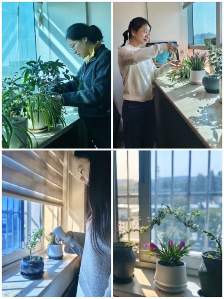相關(guān)人員進行了專題分享,從土壤配比、澆水技巧、光照需求到常見病蟲害防治,深入淺出地講解了綠植養(yǎng)護的基礎(chǔ)知識。理論講解后,進入動手實踐環(huán)節(jié),活動為每位參與者準(zhǔn)備了兩種花卉的幼苗、精致花盆、培土及各式小工具。大家紛紛變身“巧手花匠”,栽種屬于自己的的綠植,端著自己心愛的盆栽放到辦公室的陽臺上,接受光的溫暖。