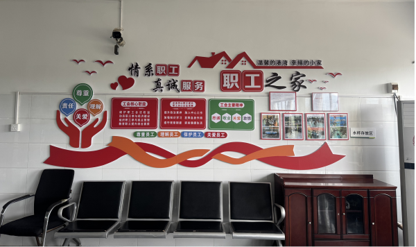 四是立足特色,堅持元素凸顯“有歸屬”。在“陣地”上將工會標識懸掛外墻,強化“家”的辨識度和職工的歸屬感。內(nèi)部精心設(shè)計的宣傳展示板(政策文件、集體榮譽、職工風采、文明公約)以及滾動播放工會宣傳片、培訓課程、勞模工匠事跡、政策解讀的移動電視,在空間營造“有歸屬”方面凸顯工會元素,展現(xiàn)了濃厚的企業(yè)文化氛圍,讓職工直觀感受到“家”的精神內(nèi)核和工會作為,增強了認同感。