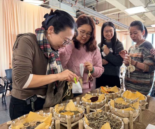 活動伊始,在專業(yè)講解員的引導(dǎo)下,大家步入“登樓游園”古代生活器物展的雅致空間。一件件古樸典雅的家居器物與文房雅玩靜靜陳列,仿佛在訴說舊時生活的從容與詩意。職工們駐足細(xì)觀,沉浸于傳統(tǒng)美學(xué)的意境之中,在器物與空間的對話里,感受跨越時空的生活智慧與人文韻味。隨后進(jìn)行的古法香囊手工制作環(huán)節(jié),將現(xiàn)場氛圍推向高潮。大家興致盎然,選取丁香、桂花、吳茱萸等天然香料,依個人喜好精心配比、細(xì)心填裝,在一捻一放之間,不僅體驗著手作的專注與成就感,更在幽幽香氣中舒緩情緒、靜心寧神。不一會兒,一個個獨具個人風(fēng)格的解壓香囊陸續(xù)完成,成為每位職工專屬的“情緒調(diào)節(jié)小物”。