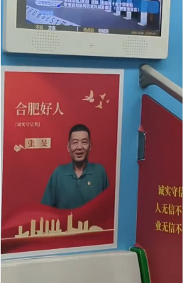 近日,“合肥好人”張旻的宣傳照片在合肥地鐵軌道交通3號線車廂內(nèi)張貼展示,讓這位郵政行業(yè)“最美駕駛員”走進更多市民視野,進一步擴大合肥郵區(qū)中心勞模先進的社會影響力。