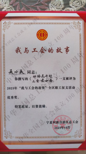 近日,寧夏回族自治區(qū)總工會(huì)“我與工會(huì)的故事”全區(qū)職工征文活動(dòng)評選結(jié)果揭曉,銀川郵政工會(huì)選送的職工吳小英憑借真摯動(dòng)人的作品榮獲優(yōu)秀獎(jiǎng)。