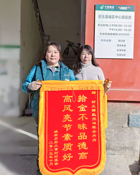 近日,河南省新鄉(xiāng)市封丘縣城關(guān)鄉(xiāng)后大章村的村民彭大娘和村委委員一起,來(lái)到了封丘縣郵政分公司城區(qū)中心攬投部,要當(dāng)面感謝攬投員岳丹丹。不巧的是岳丹丹正在段道上投遞,二人就將一面寫(xiě)有“拾金不昧品德高,高風(fēng)亮節(jié)素質(zhì)好”的錦旗交給了攬投部?jī)?nèi)務(wù)人員。彭大娘還再三叮囑說(shuō),一定要把錦旗交給岳丹丹。