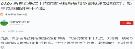 趙立群是內(nèi)蒙古烏拉特后旗鄉(xiāng)郵投遞員。近日,關(guān)于他的先進(jìn)事跡《2026 新春走基層—-內(nèi)蒙古烏拉特后旗鄉(xiāng)郵投遞員趙立群:堅(jiān)守邊境郵路三十六載》報(bào)道在“學(xué)習(xí)強(qiáng)國(guó)”內(nèi)蒙古地方平臺(tái)刊發(fā)。